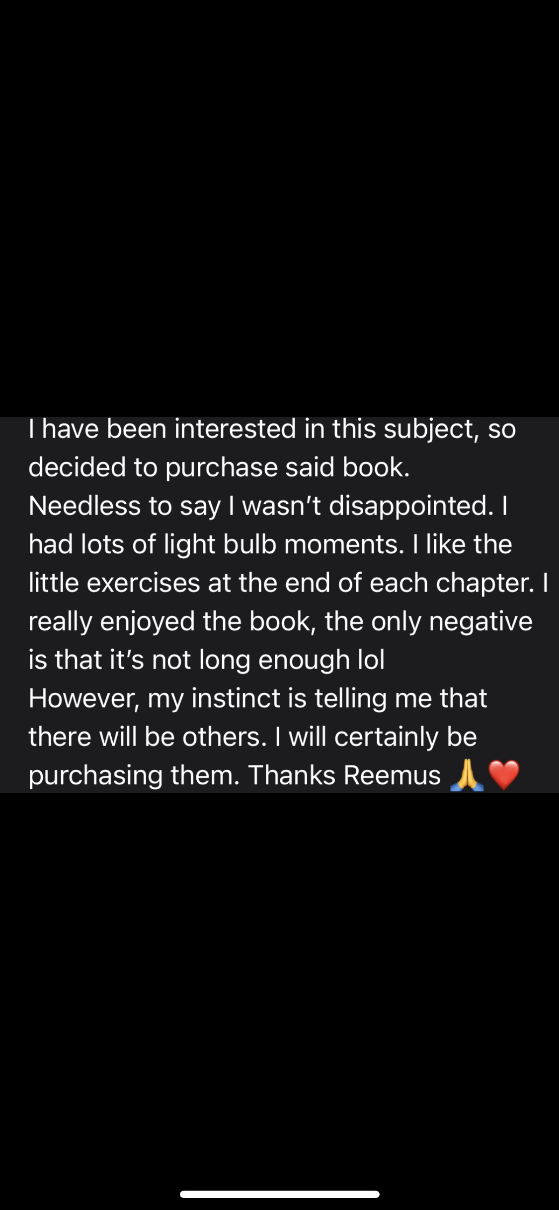 "I have been interested in this subject, so I decided to purchase said book. Needless to say I wasn't disappointed. I had a lot of light bulb moments. I like the little exercises at the end of each chapter. I really enjoyed the book, the only negative is that it's not long enough lol However, my instinct is telling me that there will be others. I will certainly be purchasing them. Thanks Reemus?❤️" - 'Ms Dukes'